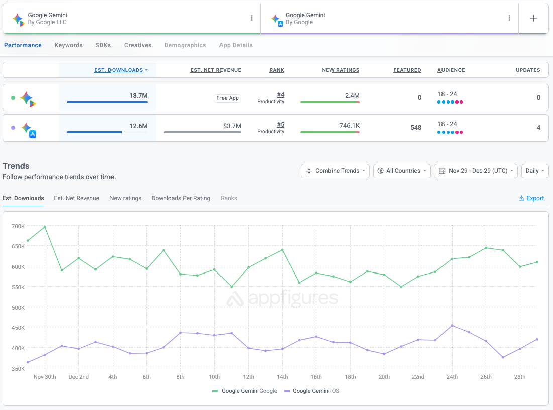 AppFigures data shows daily Gemini downloads on iOS and Android have remained flat since mid-November. The pattern is range-bound, not accelerating. - No web traffic growth