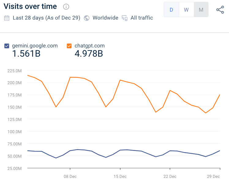 SimilarWeb data shows traffic to gemini.google.com was flat throughout December. Beginning and end points are nearly identical. - No competitive shift
