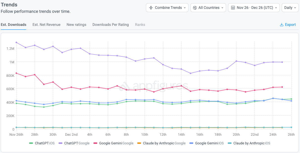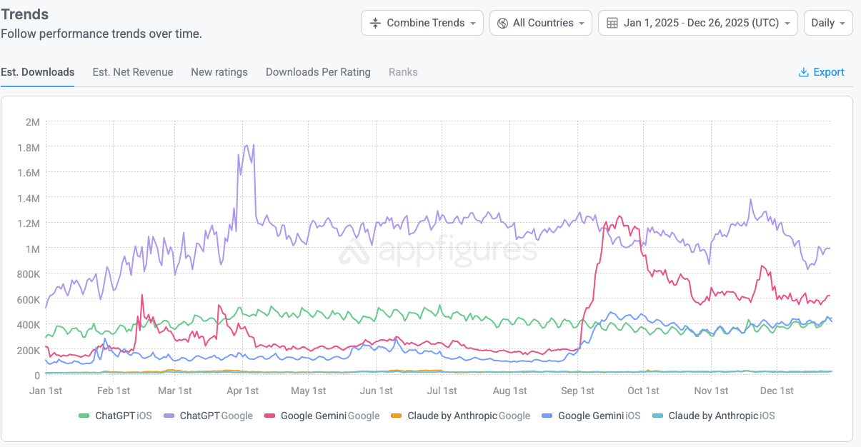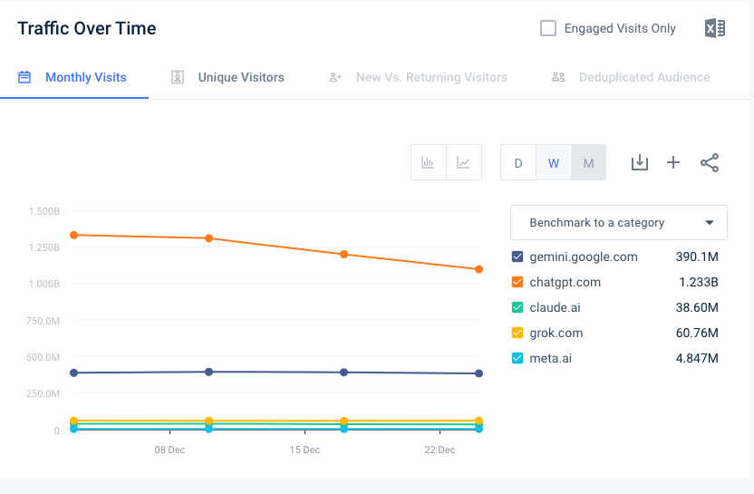 For December and all of 2025, traffic and downloads are falling or flat for ChatGPT, Gemini, Claude, LLaMA, Grok