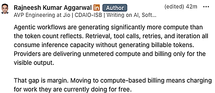 “We are seeing agent workflows expanded compute (iteration, retries, tool use) without a proportional increaser in tokens” – LLM CEO