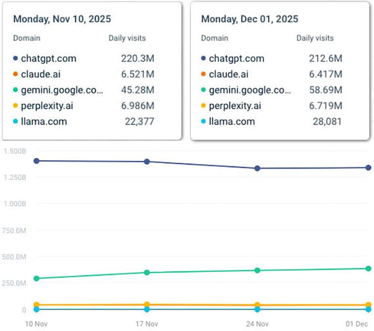 Only one platform moved in the opposite direction: Google Gemini, rising from 45.28 million daily visits to 58.69 million — nearly a 30 percent increase.