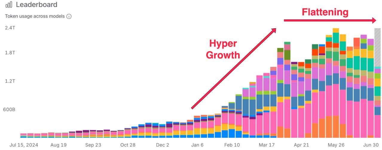 The chart, above, shows a flat trend for three out of four LLMs based on traffic in November. This tracks with flat trend we reported on here, with data from August through October. You can see that the flat trend began last spring in the chart, below, based on token usage across models.